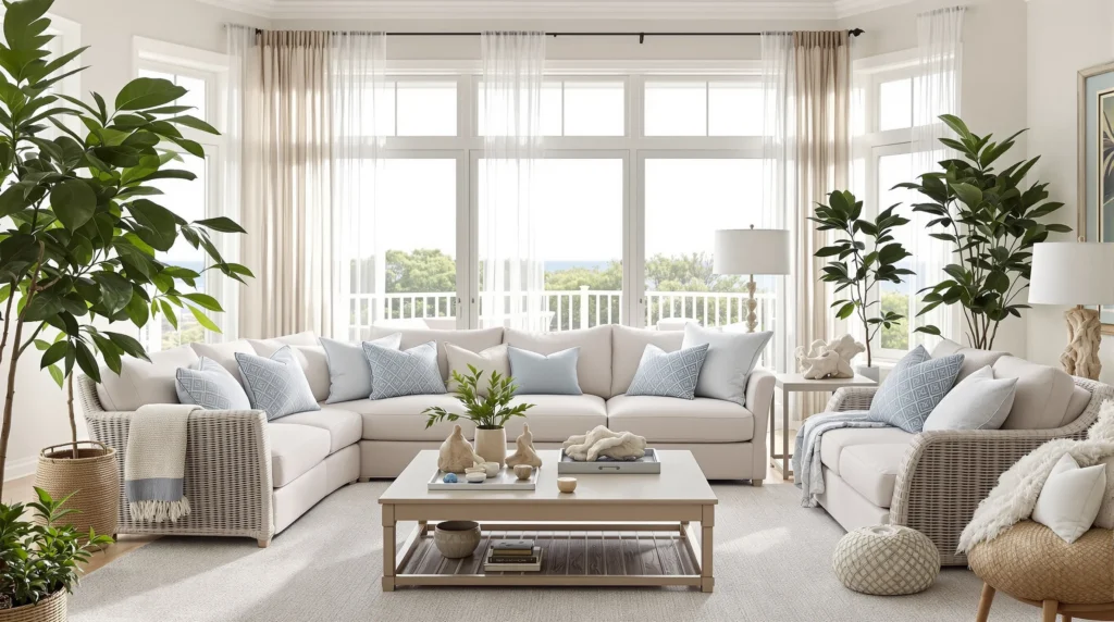 • Color Palette: Think soft whites, sandy beiges, sea glass blues, and gentle greens. These colors mimic the beach and sky, instantly making a room feel lighter.